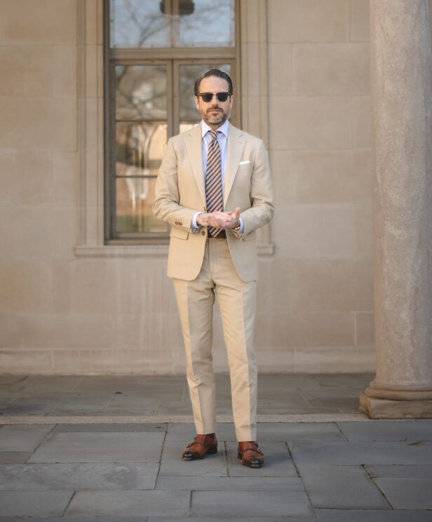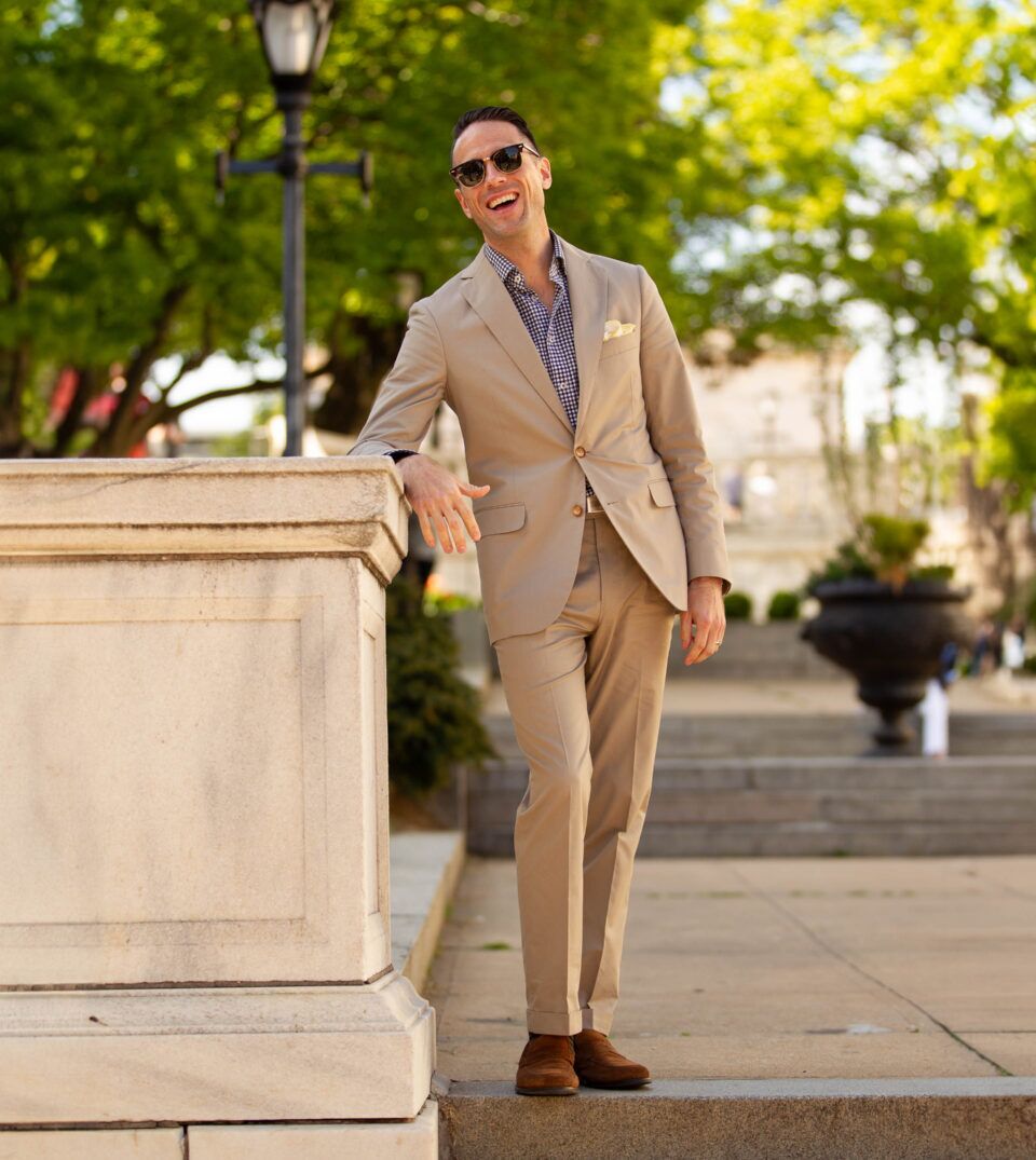 Learn MoreA khaki cotton suit is the ultimate spring and summer “casual” suit. Aside from its incredible versatility, when you own a khaki cotton suit, you also instantly expand the possibilities of your wardrobe with a sporty blazer and a workhorse pair of pants to boot. And if you’re planning a spring or summer wedding, it’s the epitome of warm weather groom attire. Wear it with a crisp white poplin dress shirt or linen dress shirt, seasonally-colored knit tie, and pair of brown derbies for an easy-going business casual look that’s dressed up without being stuffy.