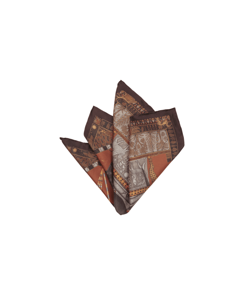 The Style GuideReclining on her engraved plinth, the street dog embodies Anubis. She rests still as a statue while worshippers adorn her. A crook and flail are placed against her sides, while a celestial bed in the form of the goddess Hathor is laid at her feet. Painted stone panels create a temple shape to surround her. She will weigh hearts for levity, and guide souls in the afterlife. This truly original pocket square is created by Sabina Savage. Each piece is printed and hand finished by artisans in Como, Italy. The detailed illustrations are carefully engineered around to create unique pocket squares with a signature aesthetic.