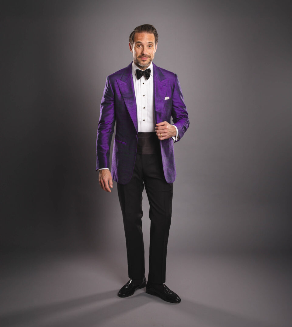 For the true statement-maker, we’re pleased to introduce our iridescent purple Dupioni silk dinner jacket.
