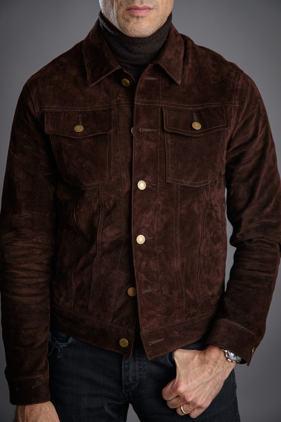 Learn MoreIf you’re looking for a way to take your casual style to the next level, look no further than our brown suede trucker jacket. Suede instantly elevates any outfit with denim jeans, while its soft, nappy texture reads as luxe and sophisticated. Wear it with a turtleneck, dark denim, and a pair of leather Chelsea boots for a dash of rockstar chic. This is an ideal transitional coat for the fall and spring, or layer it under an overcoat in the winter.