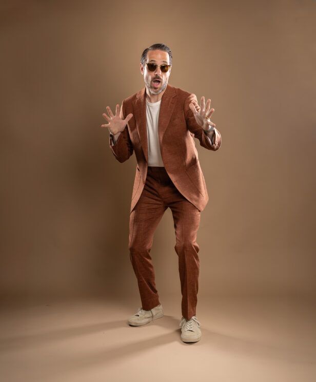 03. Terra Cotta Suit With T-Shirt & Sneakers Outfit Idea