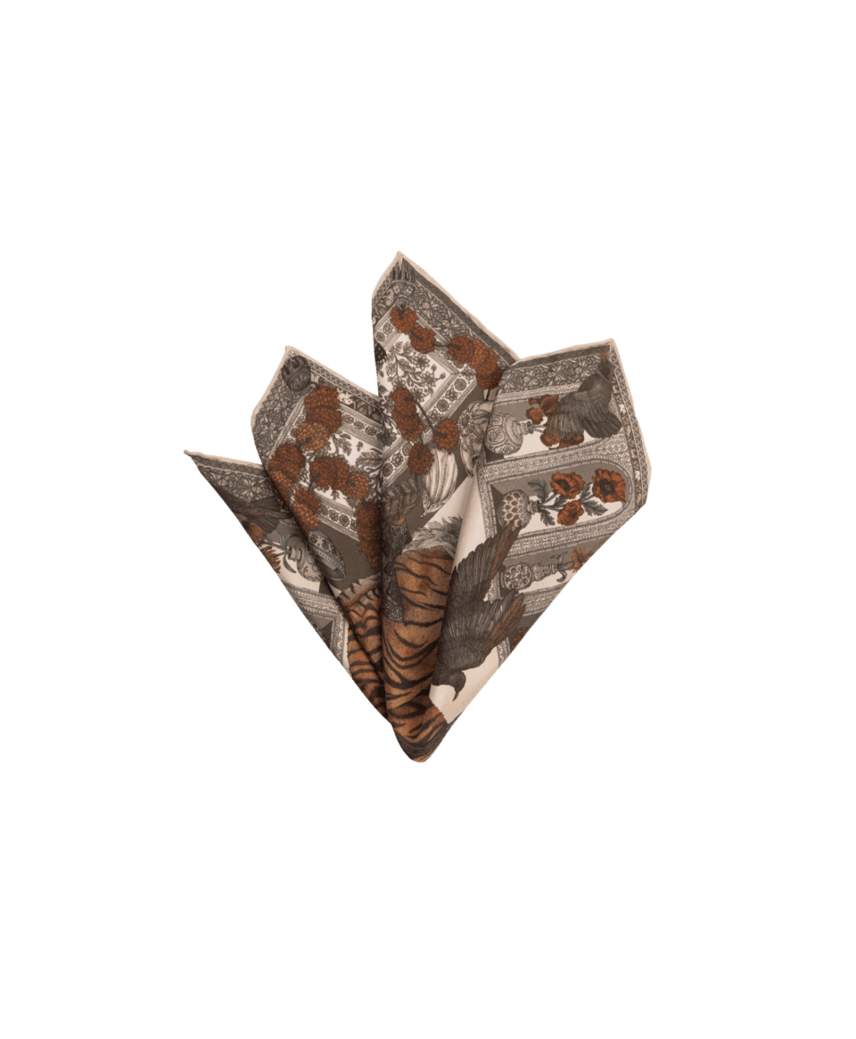 The Style GuideDeep in the forest, a tiger is trapped in a cage. A Brahmin passes through, and the tiger pleads/or release. ‘But how do I know you won’t eat me?’, questions the Brahmin. The tiger promises mercy, and the Brahmin relents. Immediately, the tiger pounces. Later, he boasts to a jackal of his smarts and wit. ‘Your story does not make any sense’ says the jackal, ‘You must show me’. The tiger jumps back info the cage to demonstrate. and !he jackal slams the door with a cunning grin. This truly original pocket square is created by Sabina Savage. Each piece is printed and hand finished by artisans in Como, Italy. The detailed illustrations are carefully engineered around to create unique pocket squares with a signature aesthetic.