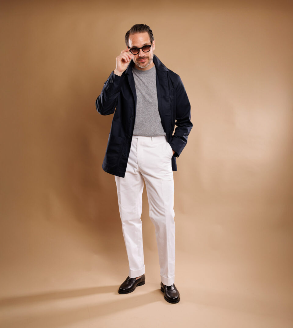 The Style GuideAs a classic summer choice or an unexpected standout winter option, out white cotton dress pants deserve a place in the modern man of style’s wardrobe. Made with a buttery soft stretch cotton and finished with belt loops, a creased front, and two-inch cuff, these are far from your typical cotton pants. Wear them with a light grey flannel sport coat, tan turtleneck, and tassel loafers for fresh winter outfit idea.