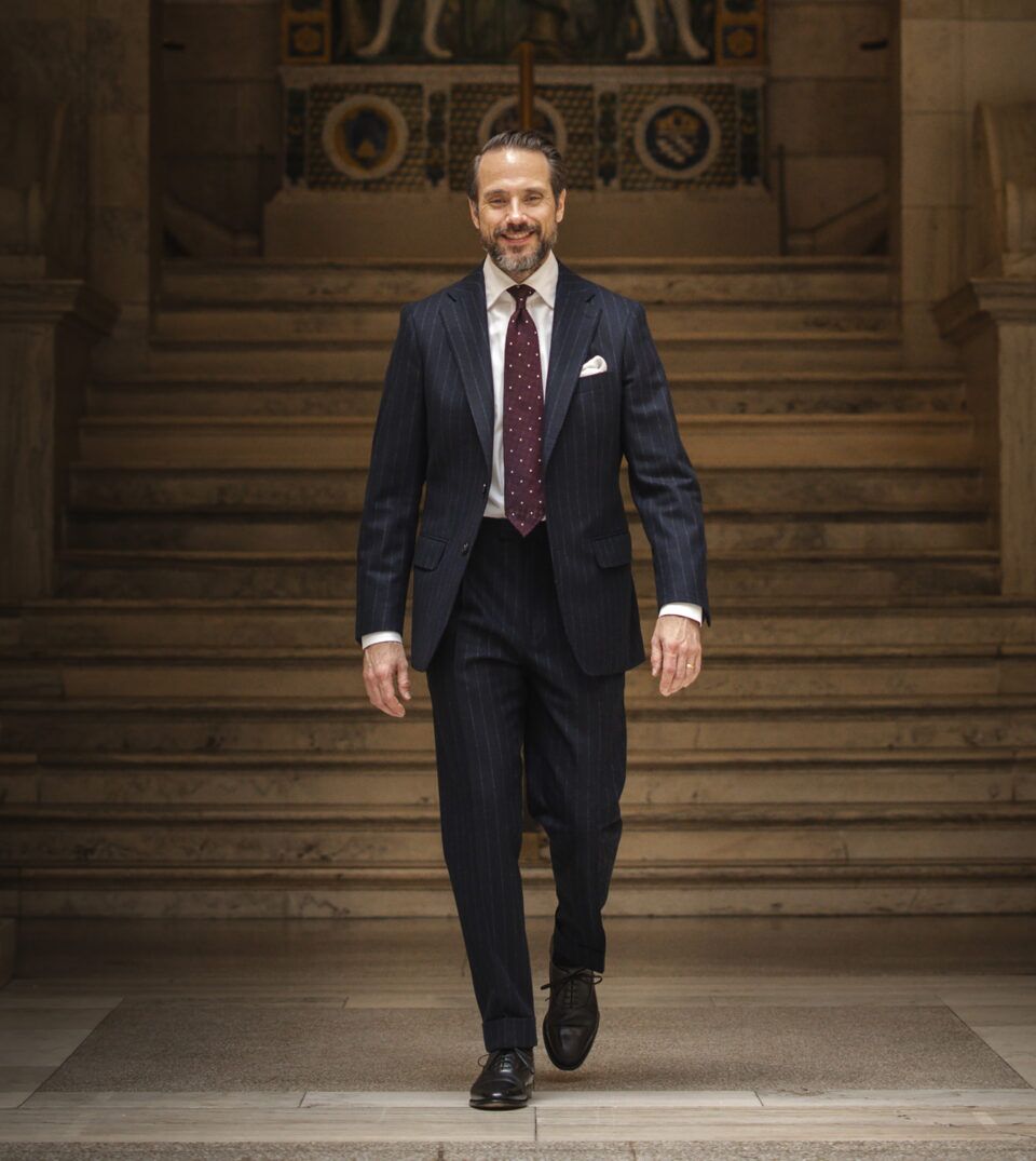 02. Navy Blue Chalk Stripe Flannel Suit with Burgundy Tie