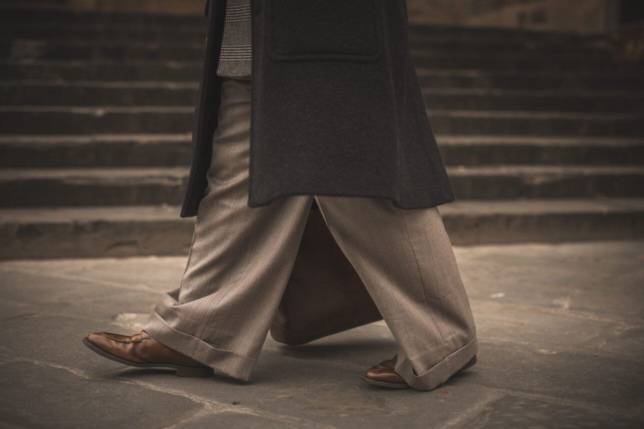 This outfit was a bit of a happy accident. I had the intention of wearing all of these pieces at Pitti Uomo — just not together. The coat is by Private White V.C., and was a necessary garment to take to Florence, especially when the temperature drops in the evening. The brushed cotton shirt and silk tie are by Budd, as well as the peccary leather gloves. The jacket is from an old collaboration between The Rake and Fox Brothers, which was part of The Rake Tailored Garments’ debut collection — a 6×1 DB. Super cool. The wide leg trousers are by Abbie Leach Atelier, and the shoes are by Crockett & Jones. The leather tote is by Bennett Winch and you’ll see me carrying it around 99 times out of 100.