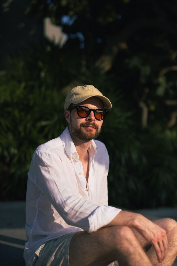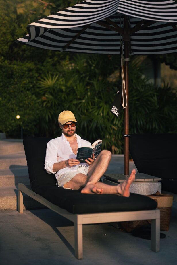 For a cool vacation look or beach look wear light and muted colors. You can go for a crisp white linen shirt and roll up the sleeves. Pair the shirt with swim shorts and a dad cap. For the shoes go for espadrilles. Finalize the look with a pair of tinted lens sunglasses with a black frame to contrast the light pieces of your outfit.