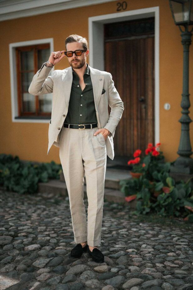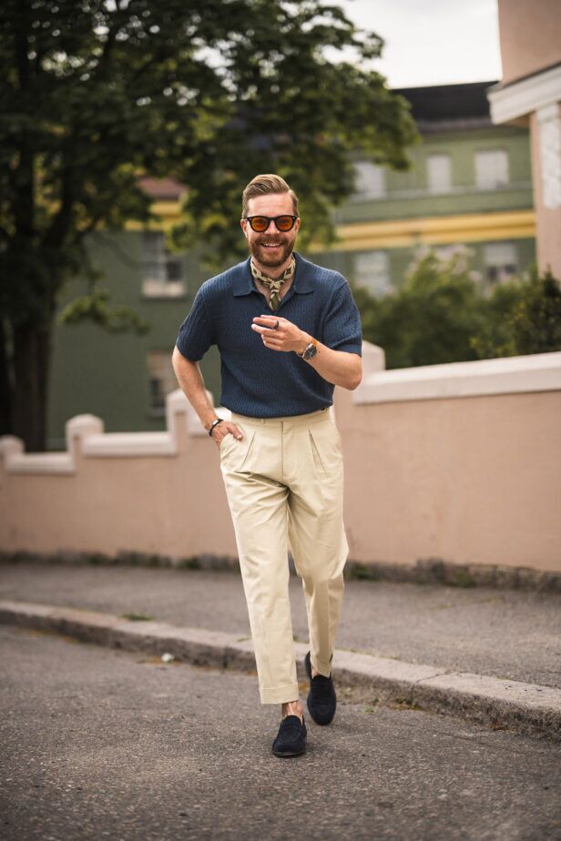 For a casual everyday summer look throw on a knitted polo, a pair of chinos and suede loafers. Then put them together with your favorite pair of yellow or orange tinted sunglasses. It’s a perfect everyday look for summer, and you can elevate it by accessorizing, like I’ve done by adding in a neckerchief, a nice watch, and some bracelets.
