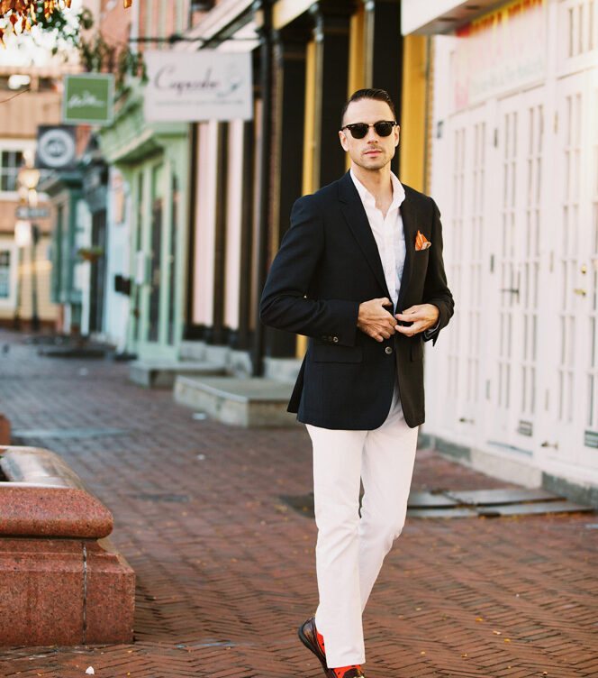 This Look: Navy blazer c/o Reiss – White button down shirt by J.Crew – White denim jeans by J.Crew – Brown leather plaque belt by J.Crew – Orange polka dot pocket square c/o Reiss – Sunglasses by Ray-Ban (Clubmaster) – Watch with brown leather band by Timex – Orange socks with navy polka dots by J.Crew – Brown leather horsebit loafers c/o Allen Edmonds (Grand Cayman)