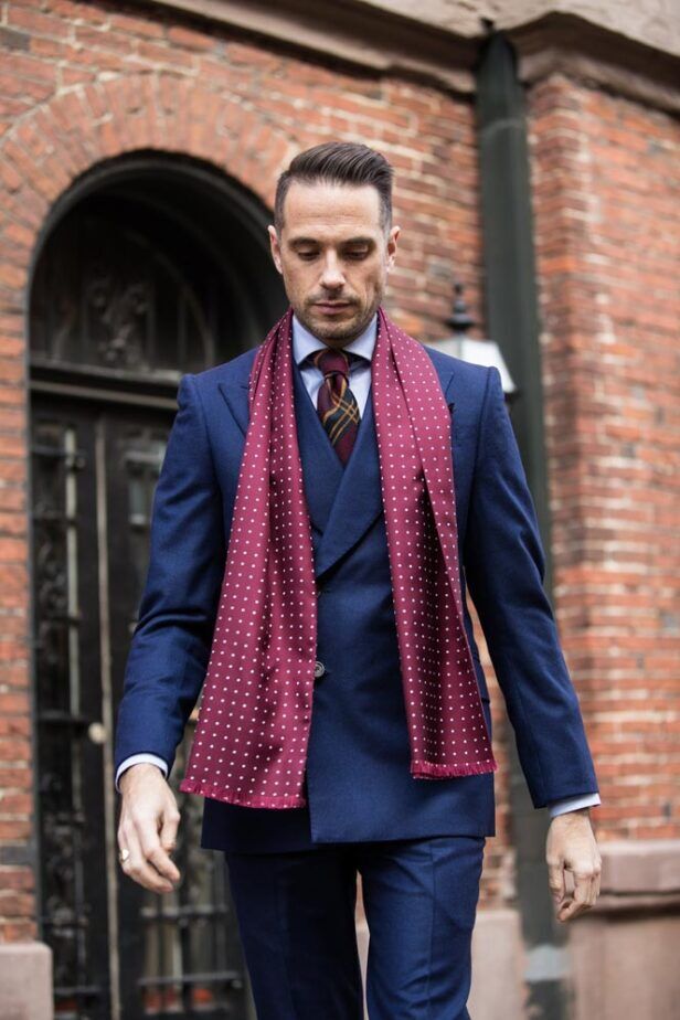 Personally, I love a silk scarf with a simple polka dot pattern because it’s just so classic and timeless. Navy is a great choice for the most versatility. Black, if you plan to wear it more with your formalwear. And burgundy is always a great choice for the holiday season.