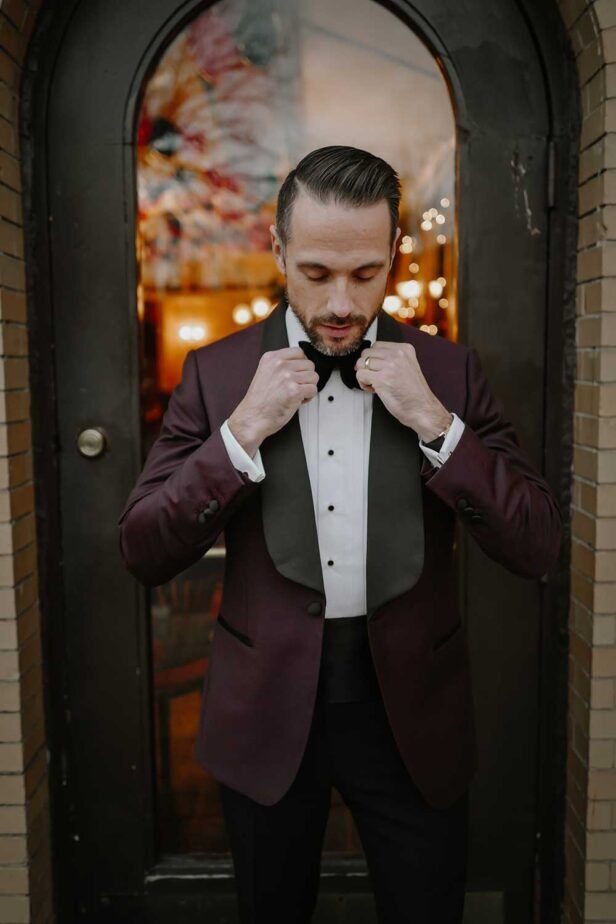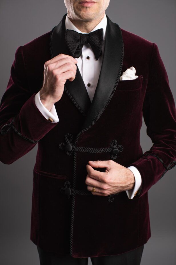 Burgundy is a great color for a dinner jacket. It’s perfect for the holidays, perfect for the wintertime, and it’s definitely something that you could wear for other formal occasions throughout the year.
