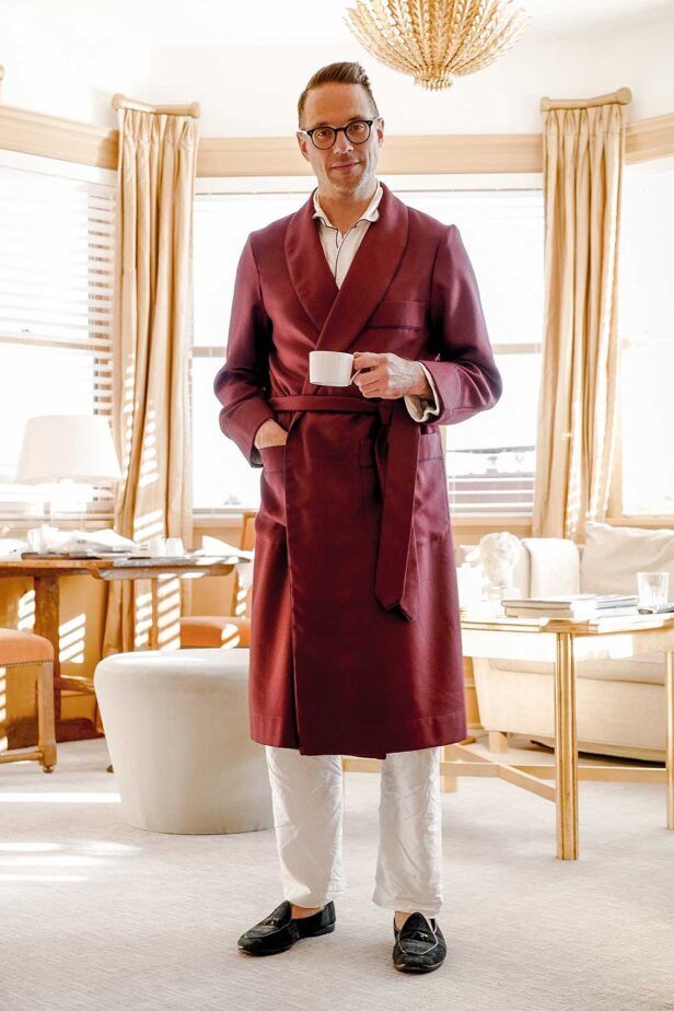 Second, is to choose a velvet fabric and opt for a slightly more eccentric smoking jacket style. Here, I’ve got on a double-breasted, shawl lapel version with great piping details around the button closures, on the sleeves, and on the edge of the lapel.